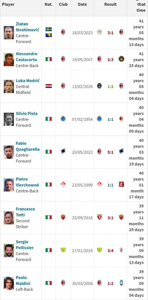 Ispred njega su samo još dvojica bivših igrača Milana, Zlatan Ibrahimović i Alessandro Costacurta. Ibrahimović je posljednji put zabio u Serie A s 41 godinom, pet mjeseci i 15 dana, dok je Costacurta postigao gol sa 41 godinom i 25 dana. Zbog toga je jasno da ove sezone Modrić ne može preteći ni jednog od njih dvojice.