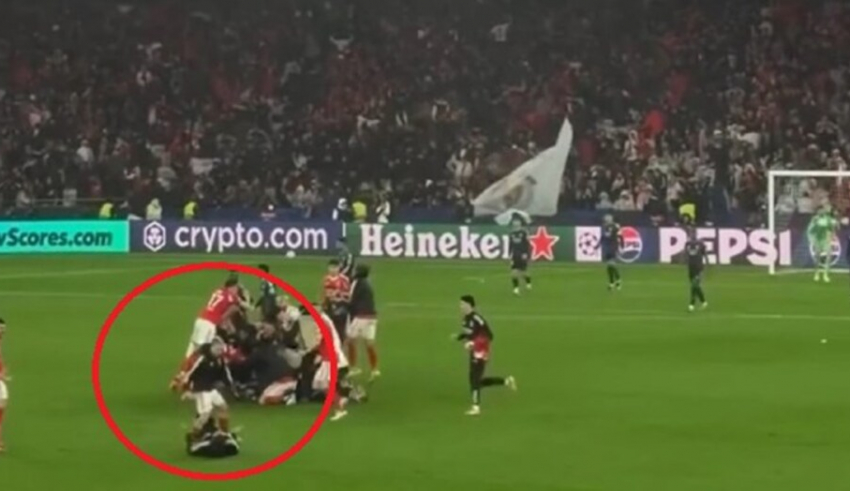 Fredrik Aursnes je ubacio iz slobodnog udarca, a ukrajinski golman je bio najviši pred golom Reala i sjajno je zabio glavom za delirijum na Лужu, što možete pogledati OVDE. Uslijedilo je razulareno slavlje navijača, igrača i trenera Benfike. U toj fešti na terenu dogodila se scena koja je postala viralna. Pomoćni trener Benfike je sa obe noge oborio igrača svoje ekipe. Nije jasno da li je opasan start napravio namerno ili se okliznuo.